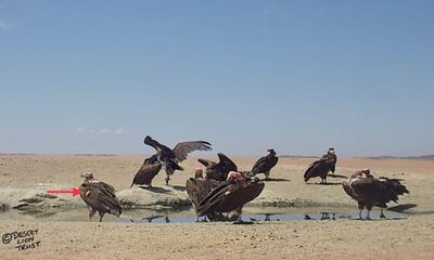 Marked Lappet-faced vultures drinking at Ganias spring